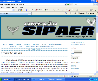 “Seu objetivo é promover a disseminação da informação técnico-científica produzida por pesquisadores e profissionais da área da ciência aeronáutica e ciências afins, voltados para a segurança de vôo, com foco nas atividades de investigação e prevenção de acidentes aeronáuticos”, afirma o Brigadeiro-do-Ar Jorge Kersul Filho, chefe do CENIPA. Os interessados em enviar artigos e contribuições para a primeira edição têm até o dia 30 de setembro. O material será lançado em 17 de novembro, como parte das comemorações do aniversário de 38 anos do CENIPA. Artigos submetidos após essa data seguirão os trâmites do processo editorial para a próxima edição. Para mais informações, acesse a página da Revista Conexão SIPAER no endereço http://inseer.ibict.br/sipaer. O nome da publicação vem do Sistema de Prevenção de Acidentes Aeronáuticos (SIPAER). São de interesse para a revista os trabalhos desenvolvidos por pesquisadores e profissionais das seguintes áreas: administração aeroportuária; aviação; busca e salvamento; ciência aeronáutica; comunicação e fraseologia; engenharia aeronáutica; ensaios em vôo; ergonomia; fator humano; gerenciamento de operações; instrução aérea; investigação de acidentes aeronáuticos; manutenção aeronáutica; medicina aeroespacial; sistema de gerenciamento da prevenção de acidentes aeronáuticos; tráfego aéreo e transporte aeromédico. Poderão ser aceitos artigos de áreas transversais, como economia do transporte aéreo, direito aeronáutico, regulamentação aeronáutica, ciência da informação e outras, desde que apresentem trabalhos realizados sob o enfoque da segurança de vôo. Considerando o pioneirismo da Revista Conexão SIPAER como um periódico científico da área de ciências aeronáuticas com foco na segurança de vôo, a estratégia de atuação editorial está sendo desenvolvida de forma a maximizar a penetração da revista nas comunidades aeronáutica e científica. A captação de autores e de leitores, bem como a participação das diversas instituições ligadas às atividades aéreas e de pesquisa é desenvolvida por meio da criação de uma rede colaborativa, agregadora dos esforços de pesquisa. O conteúdo de uma revista de comunicação científica é estabelecido por contribuições dos próprios profissionais da área e não pela instituição que edita a publicação. Os artigos serão submetidos ao processo editorial de rotina da revista, o qual estará sendo testado durante o período do pré-lançamento.